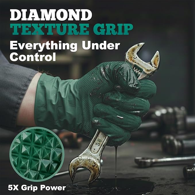 Most disposable gloves are meant for light chores and fall apart when you bring out real tools, chemicals, or heavy equipment. TitanFlex 8-mil Nitrile Gloves are built for mechanics, tradespeople, and serious DIY work. The diamond texture gives you grip in oil, water, and grime, while the bright green color keeps your hands visible around moving parts and busy work areas. You get both toughness and control, instead of choosing one or the other.