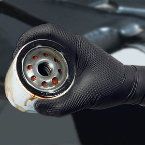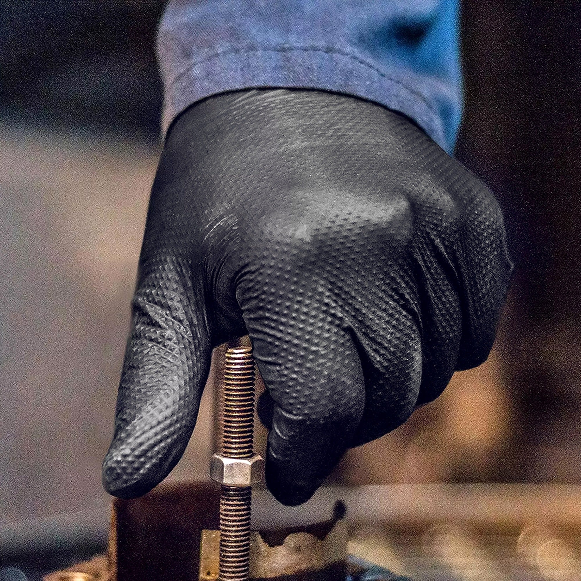 Fingers and palms fully textured with raised diamond patterns in Thor Grip arrays, providing 60% more gripping power, even in wet and greasy environments. Meanwhile, the snug-fit nitrile gloves still offer decent dexterity that helps handle small objects and tools neatly.