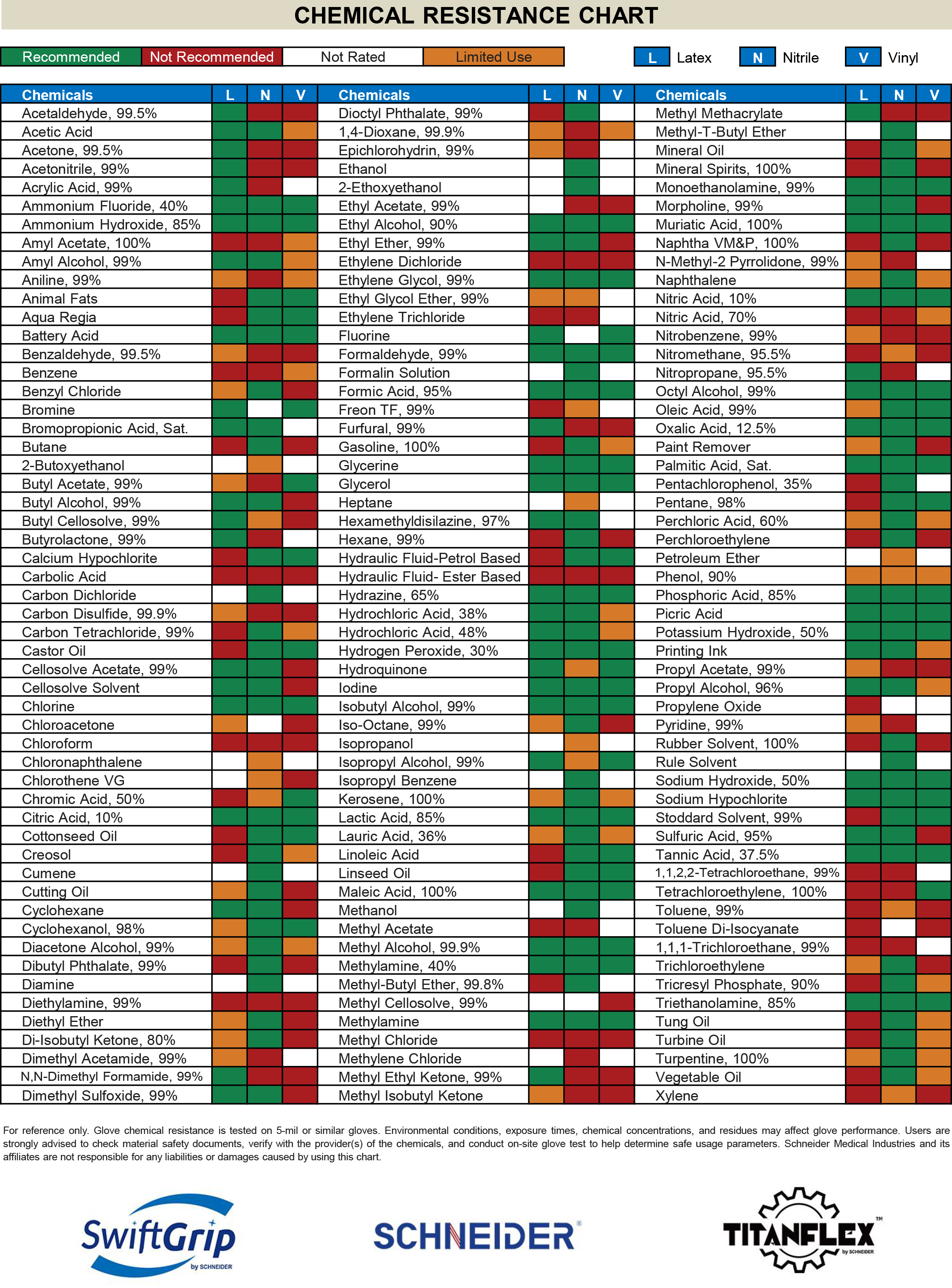 Choosing the right material for chemical protection is essential for safety and performance. This chart helps you compare how common materials such as nitrile, vinyl, and latex react to different chemicals including acids, bases, and solvents. Use it as a quick guide when selecting gloves or protective gear to make sure they can handle the substances you work with every day.